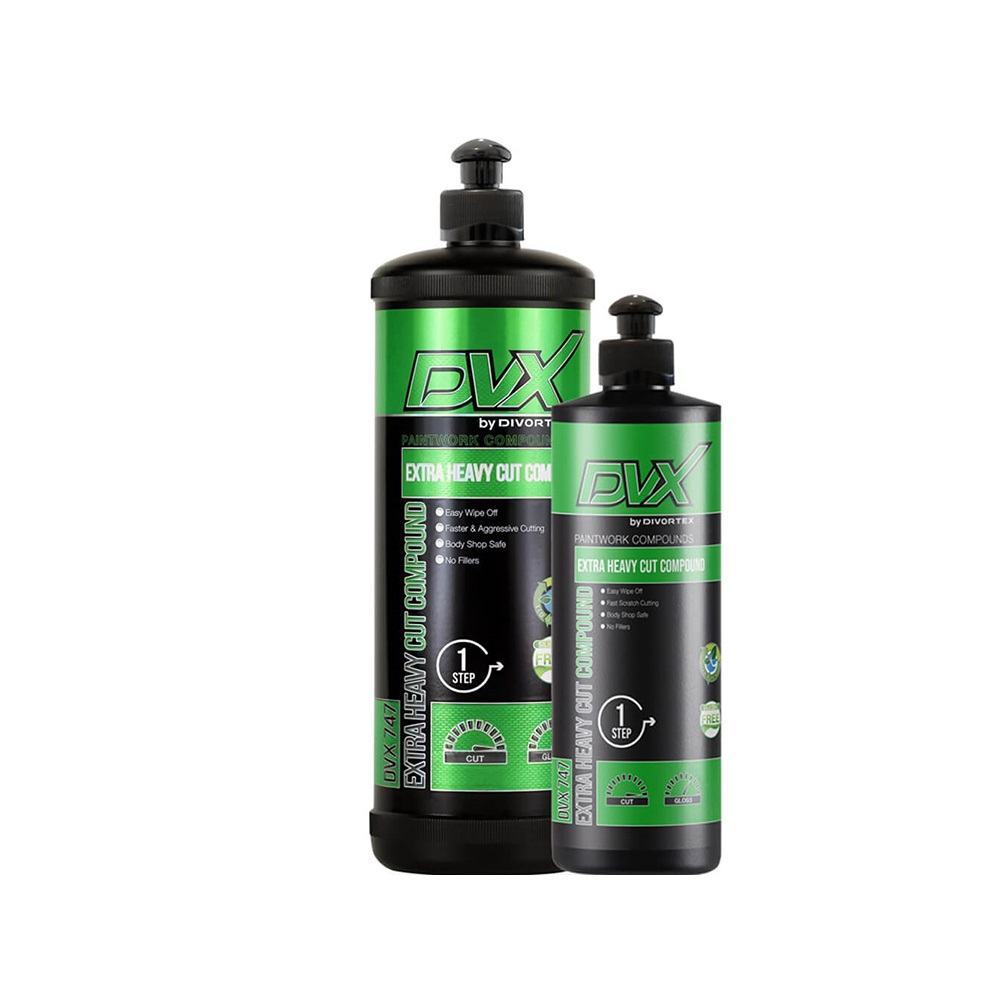 DVX Single Step Wax 3’ü 1 arada pasta cila ve boya koruma seriside bu gibi yüzeylerde oluşan hareleri ve micro çizikleri, alüminyum oksit tozu bileşeni ile yok edilmesinde üstün performans göstermektedir. Kaliteli formülasyonu kusurları kolaylıkla ortadan kaldırırken, boyaya ekstradan ıslak görünümlü parlaklık da kazandırmaktadır. DVX Extra Heavy Cut Compound Ağır Çizik Alıcı Pasta ise; 1. adım bir pasta ürünüdür.
